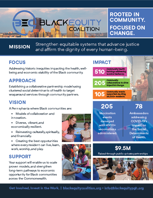 The Black Equity Coalition (BEC) needed a high-impact visual tool to communicate their complex, multi-faceted work and impact in Pennsylvania.